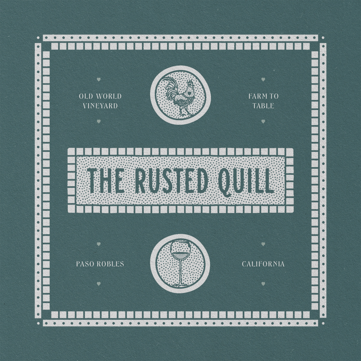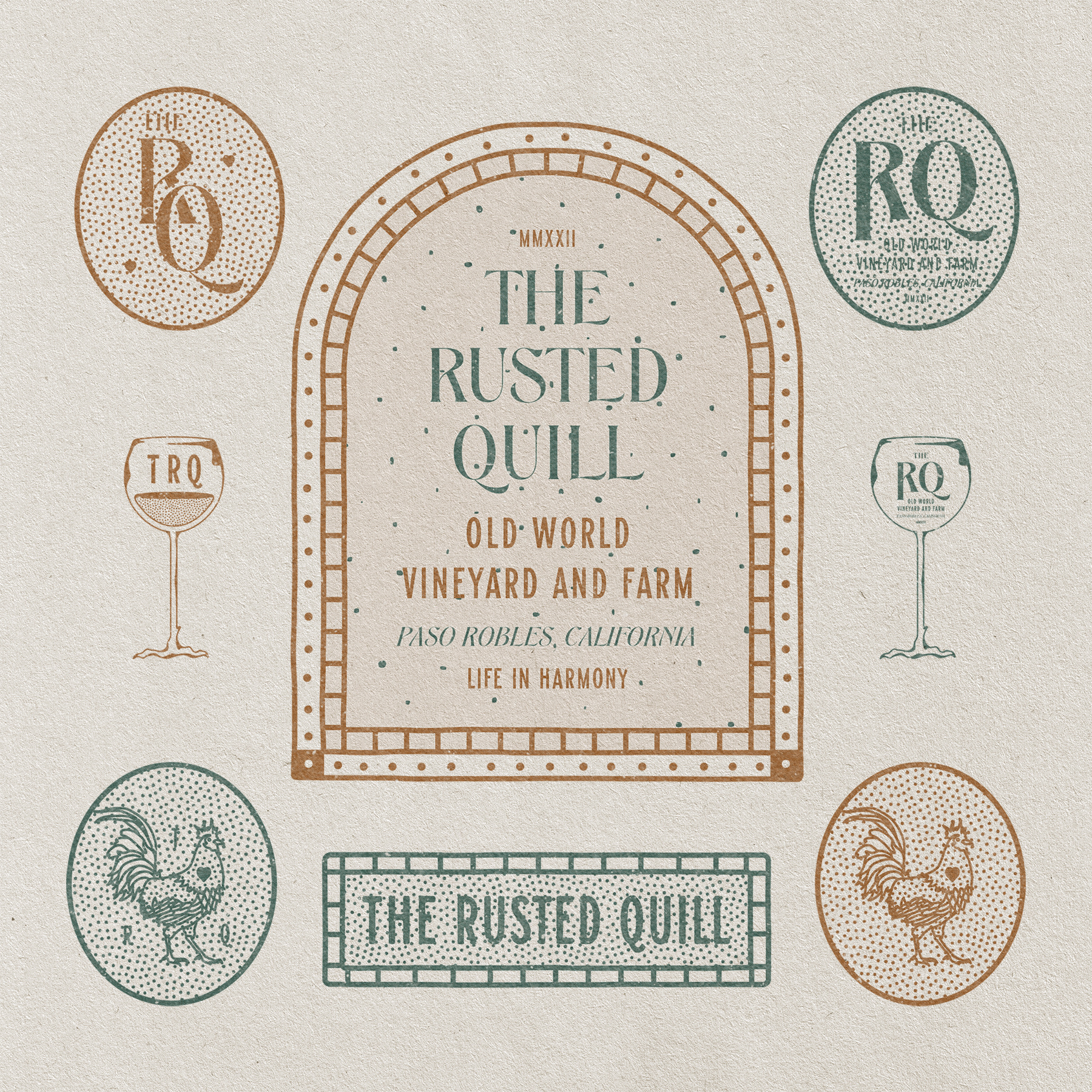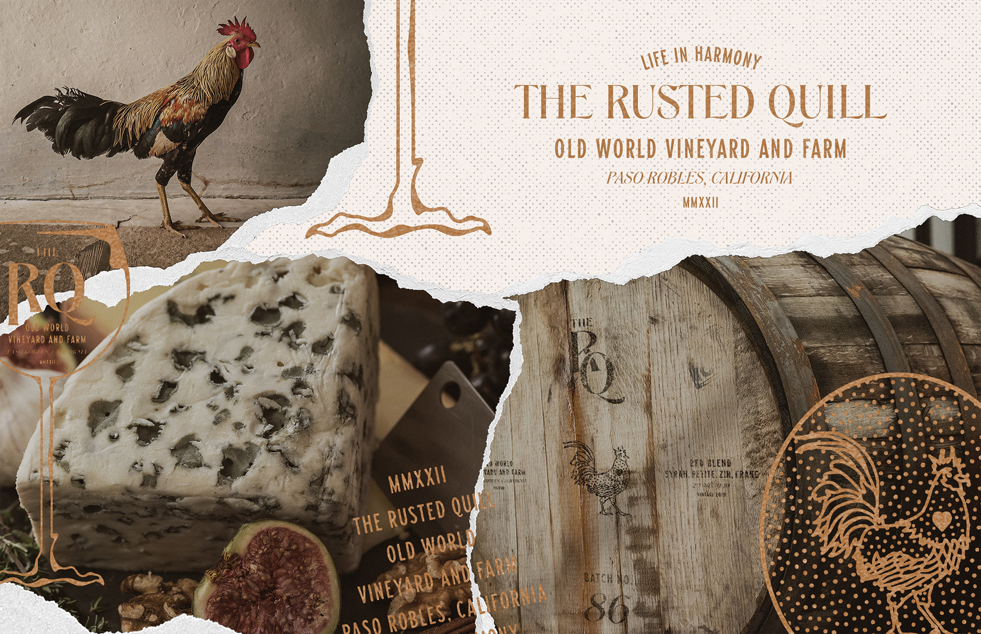This is a branding system for a small 'old world' style vineyard and farm, serving organic wines and farm-to-table cuisine in Paso Robles, California. The efficiency, history, and sophistication are conveyed in the overall brand design and photo aesthetic.